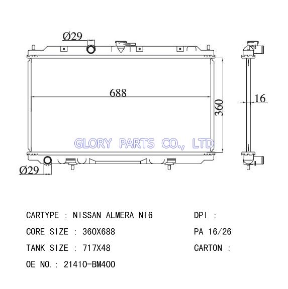 DPI: NISSENS: OEM: 21410-BM700 CAR MODEL: Nissan Almera N16 01- Auto radiator/automovil radiadores