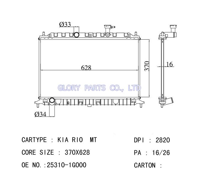 DPI: 2820 NISSENS: 66687 OEM: 25310-1G000 Car Model: Kia R10 Auto radiator/automovil radiadores