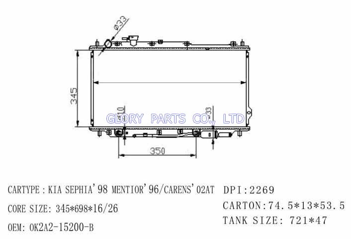 DPI: 2269 NISSENS: 66604 OEM: OK2A1-15200B Car Model: Kia Sephia'98 Auto radiator/automovil radiadores
