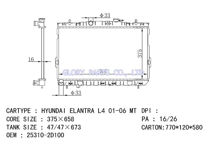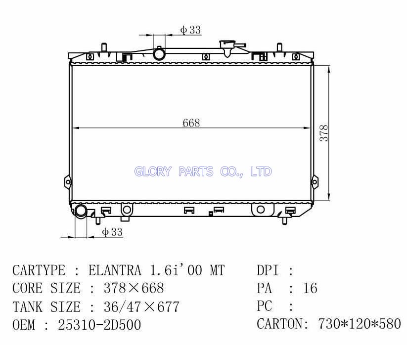 DPI: NISSENS: 67025 OEM: 25310-2D510 Car Model: Hyundai Elantra 1.6I'00 Auto radiator/automovil radiadores