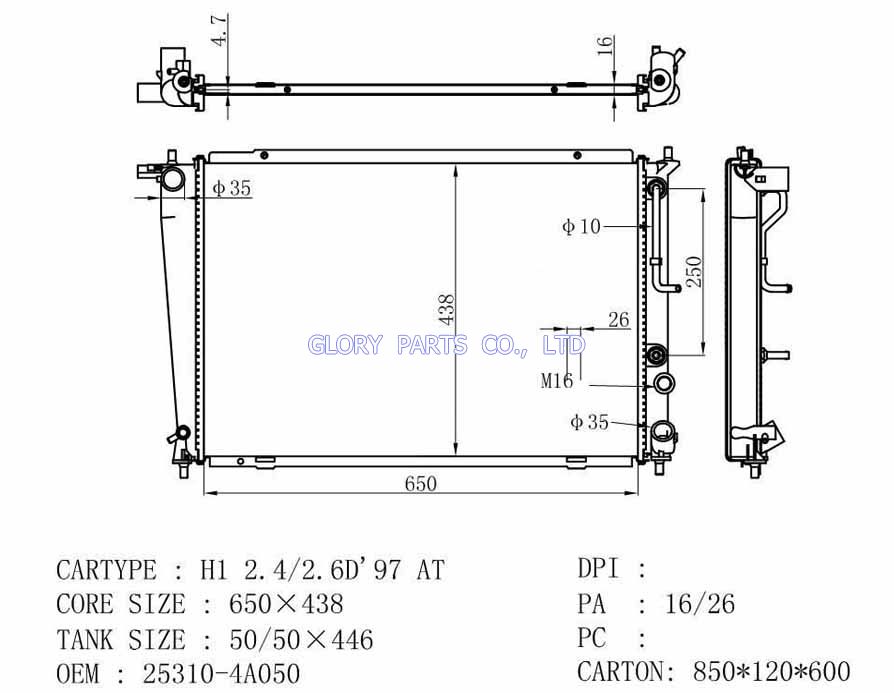 DPI: NISSENS: 670381/67037 OEM: 25310-4A050 Car Model: Hyundai H1 2.4/2.6D'97 Auto radiator/automovil radiadores