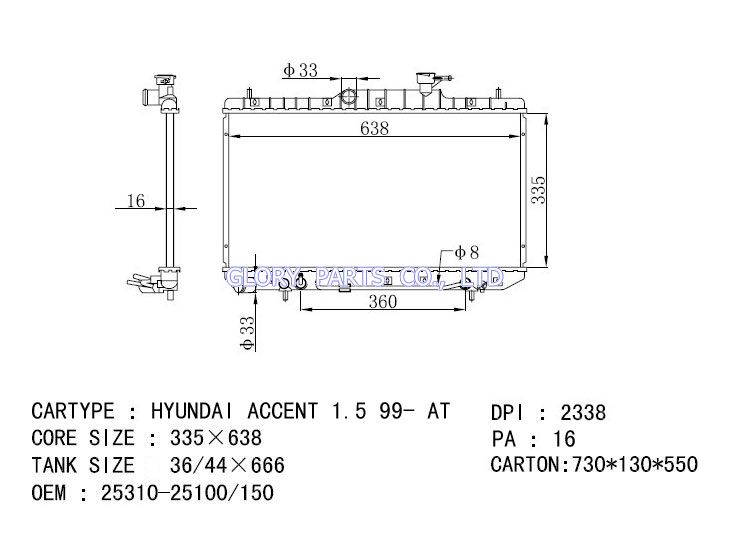 DPI: 2338 NISSENS: 67023 OEM: 25310-25100/25310-25300 Car Model: Hyundai Accent Auto radiator/automovil radiadores