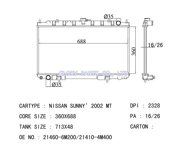 DPI: 2328 NISSENS: OEM: 21410-6M000/21410-4M400 MT CAR MODEL: Nissan Sunny'2002 Auto radiator/automovil radiadores