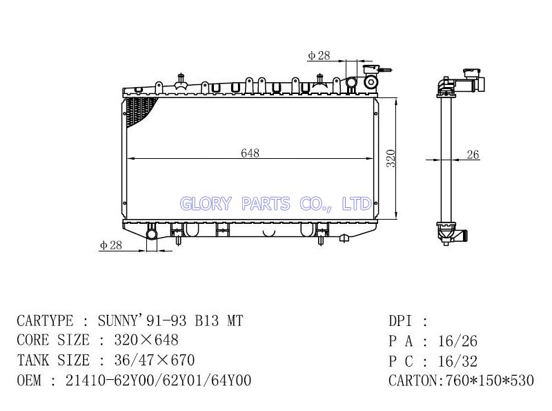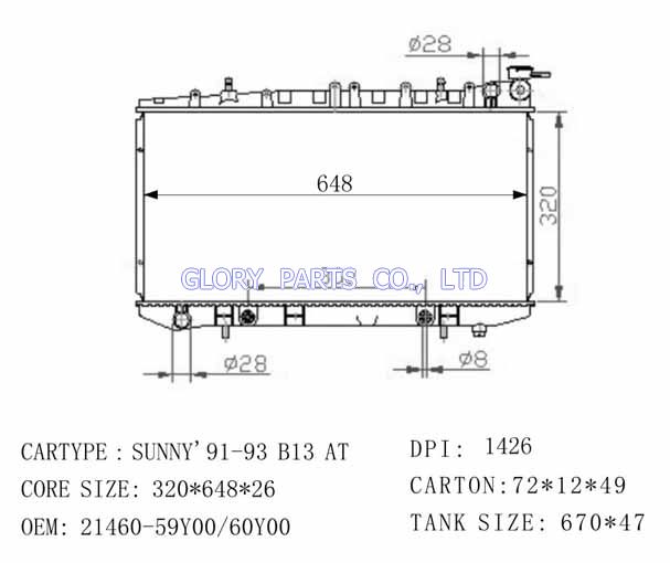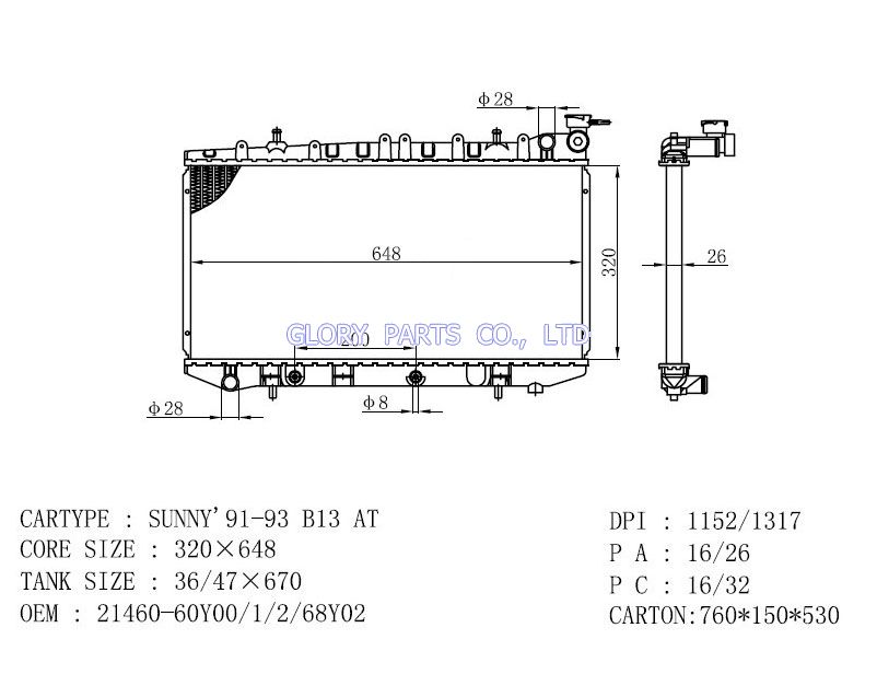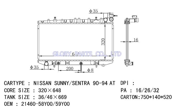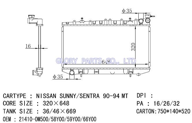 DPI: 1152/1317/1977 NISSENS: 62952/62965 OEM: 21410-64Y00/21460-58Y00 AT CAR MODEL: Nissan Sunny'91-93 B13 Auto radiator/automovil radiadores