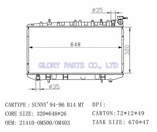 DPI: NISSENS: 62961 OEM: 21410-0M500/21410-0M403 CAR MODEL: Nissan Sunny'94-96 Auto radiator/automovil radiadores