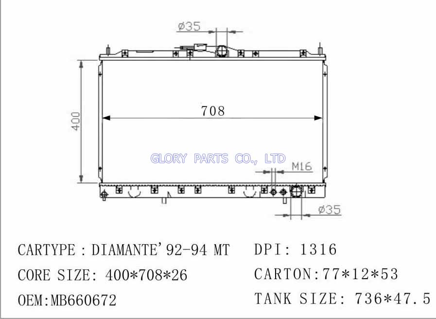 DPI: 1316 NISSENS: 62862 OEM: MB660673/MB924266 CAR MODEL: Mitsubishi Diamante Auto radiator/automovil radiadores