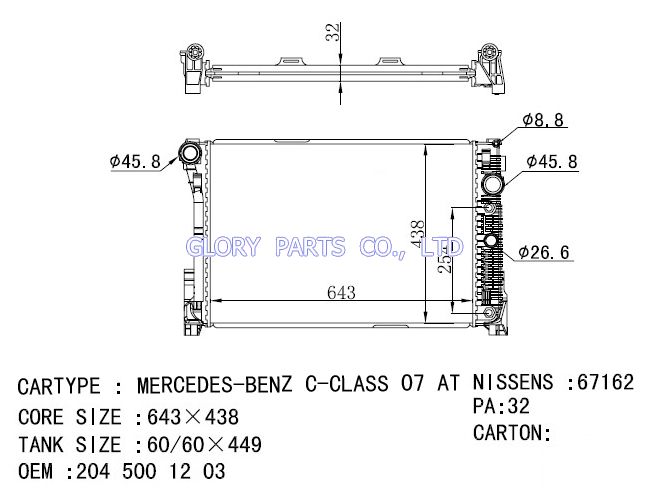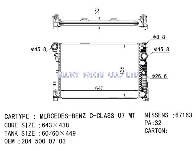 DPI: NISSENS: 67163 OEM: 2045000703 CAR MODEL:Mercedes-Benz C-Class 07- Auto radiator/automovil radiadores