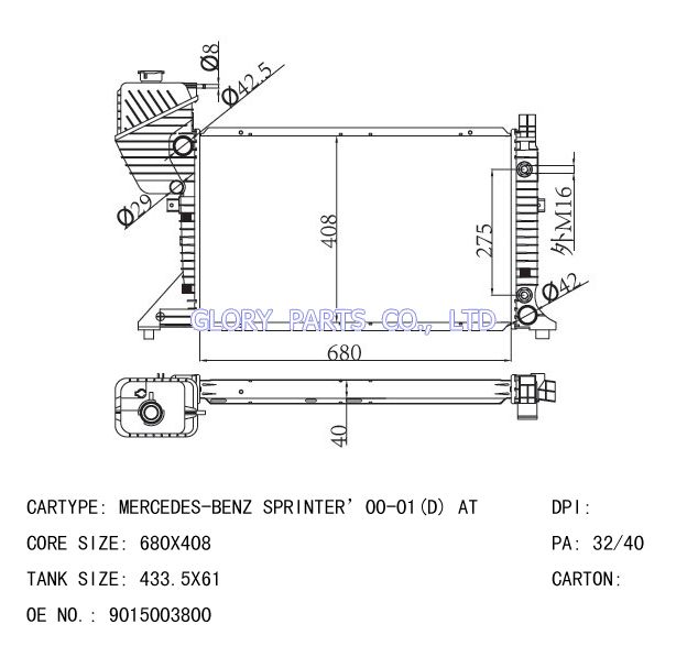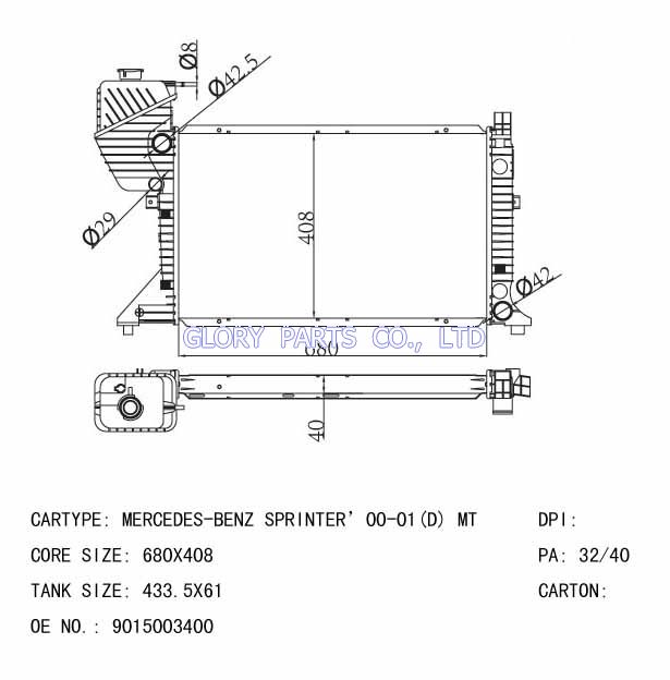 DPI: NISSENS: 62685 OEM: 9015002400/9015002800 CAR MODEL: Mercedes-Benz SPRINER Auto radiator/automovil radiadores